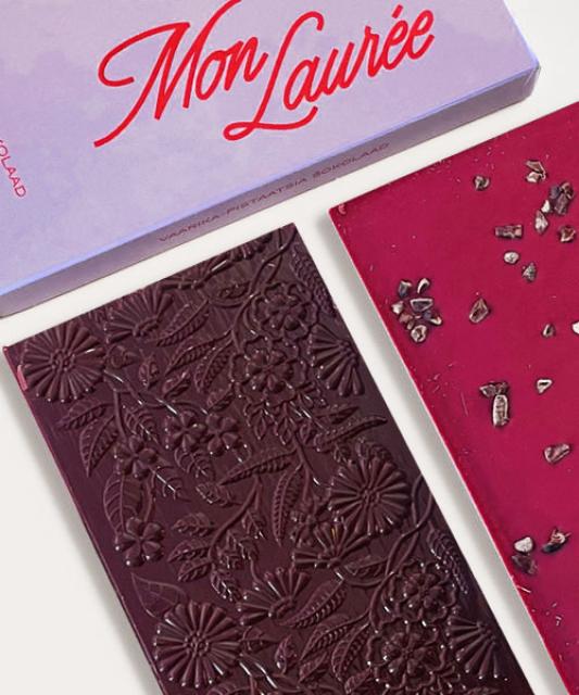The tartness of raspberry chocolate, the saltiness of pistachios and the sweetness of white chocolate create an irresistible combination. On the back of the chocolate, you can find pistachios and crispy raspberry chocolate balls. Min 100 g.