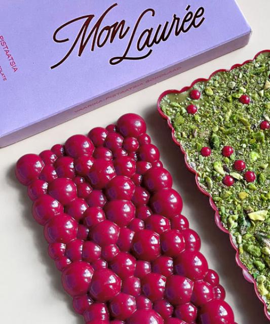 Ingredients: Valrhona chocolate from France (sugar, cocoa butter, freeze-dried raspberry powder 11.5% emulsifier: sunflower lecithin), pistachio paste 99.9%, salt, whole milk powder, natural vanilla extract, pistachios, raspberry cereal crisps: (wheat flour, sugar, cocoa butter, wheat malt, wheat starch, raising agent E500, salt, freeze-dried raspberry powder 10.1% maltodextrin, emulsifier sunflower lecithin)