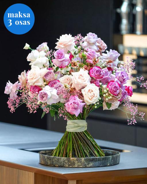 This product is only available in Tallinn. Create a sensual romantic experience for your most desirable woman with a spectacular and luxurious rose bouquet Viva la Diva! Flower world's high fashion and original creativity meet in this exceptional masterpiece from the DeLuxe bouquet series, which is hand-arranged only by Interflora's top florists. Longest and highest quality multicolored large-flowered roses, Lisianthuses, airy gypsum flowers, Hypericum are used to create a unique bouquet.
