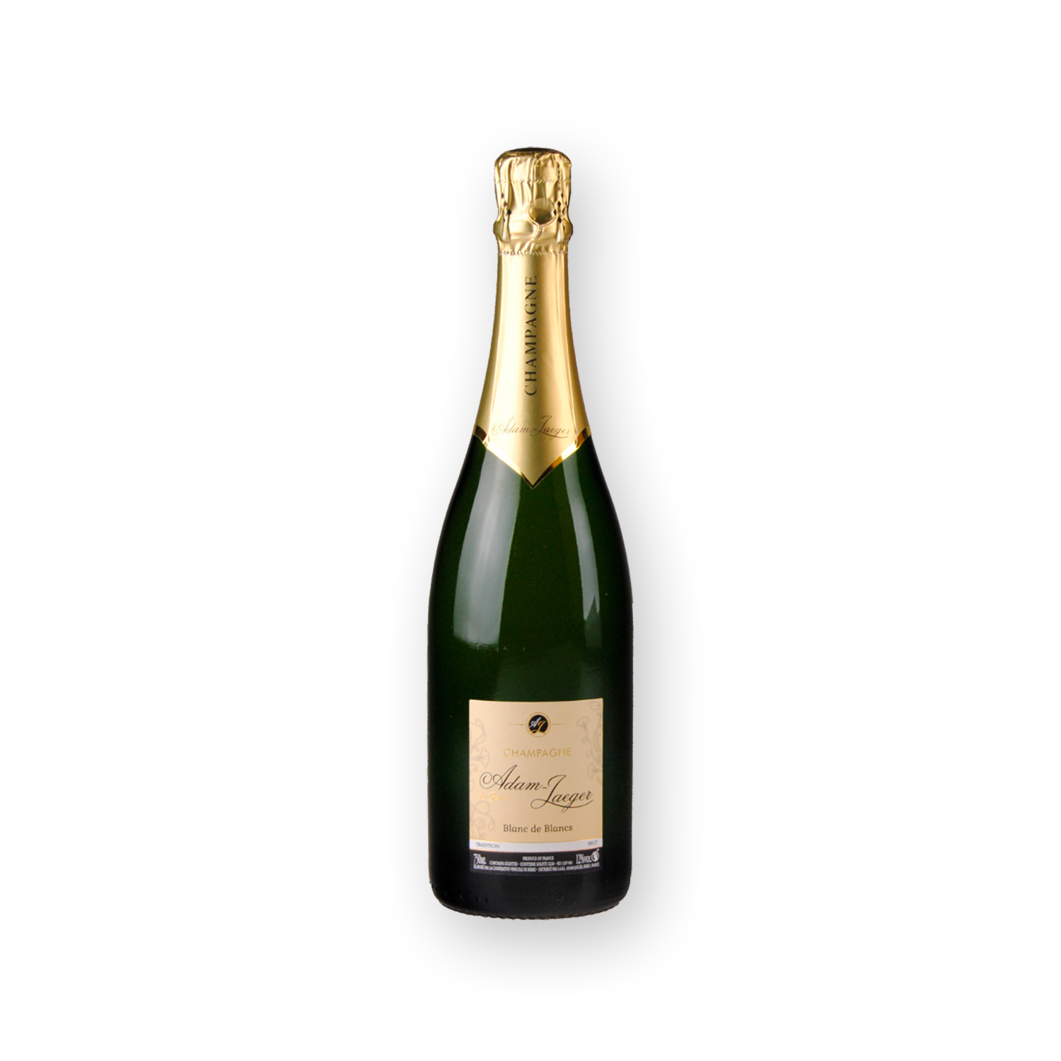 Wooden box filled with some red roses and other seasonal flowers. The whole is completed with a bottle of Champagne Adam Jaeger.