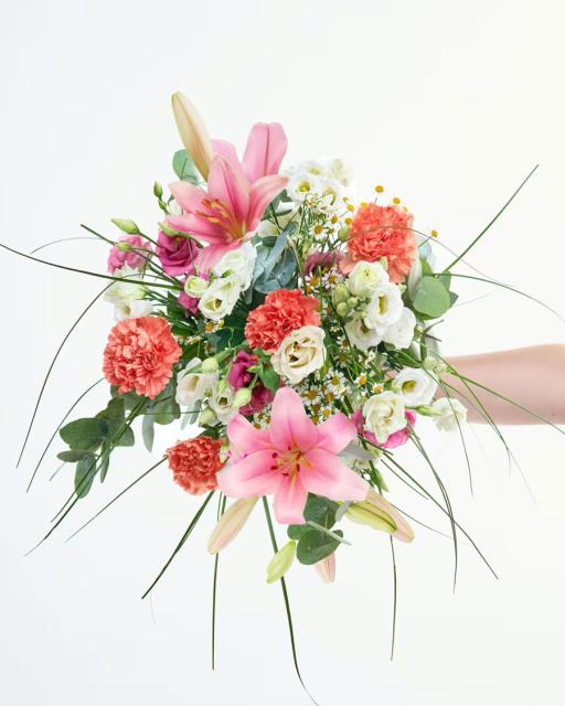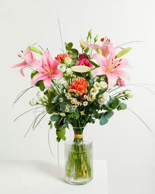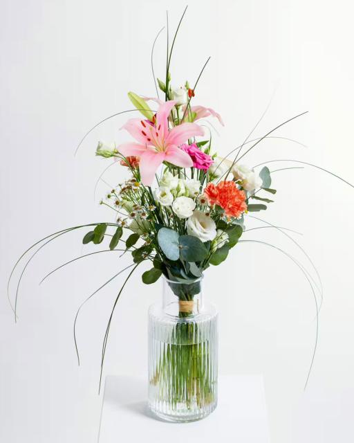 Deliver your heart's desires with a bouquet of flowers shining with happiness. Royal lilies with cheerfully colored flowers and vibrant green will bring a smile to the face of every recipient. Florist will gift wrap the bouquet. The vase on the picture is illustrative and can be purchased separately.