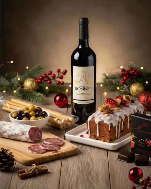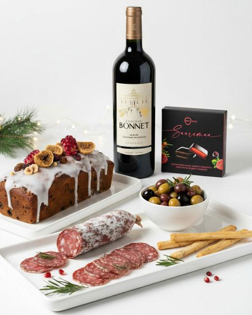 Väike kinkekarp gurmee, jõulukeeksi ja punase kvaliteetveiniga.